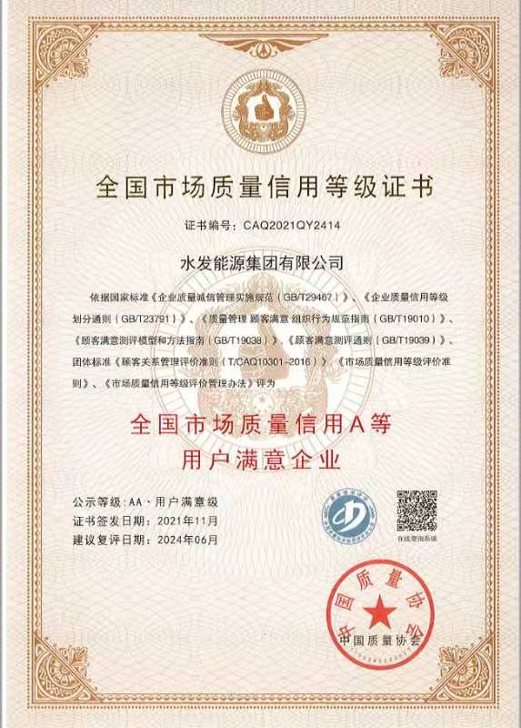 近日,中國(guó)質(zhì)量協(xié)會(huì)發(fā)布2021年全國(guó)市場(chǎng)質(zhì)量信用等級(jí)評(píng)價(jià)結(jié)果,水發(fā)能源集團(tuán)獲評(píng)“2021年全國(guó)市場(chǎng)質(zhì)量信用A等(用戶滿意企業(yè))AA級(jí)稱(chēng)號(hào)。