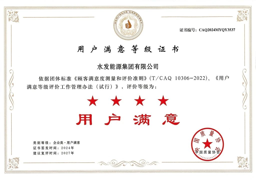 捷報!水發(fā)能源獲評2024年度全國用戶滿意四星級企業(yè)